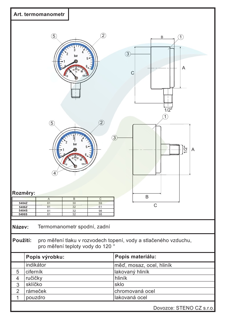 Termomanometr 0-6bar, 0-120°C,1/2" zadní vývod.