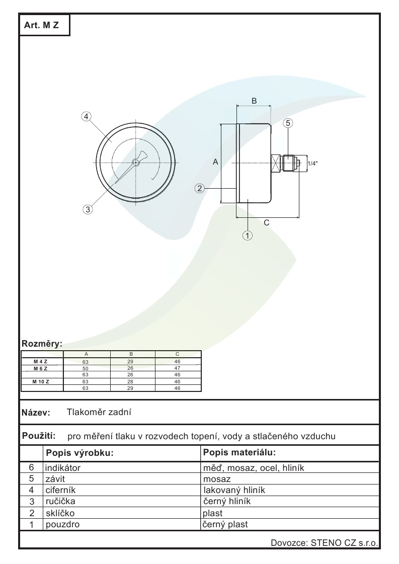 Pro měření tlaku v rozvodech topení, vody a stlačeného vzduchu. Technický výkres v sekci Ke stažení.