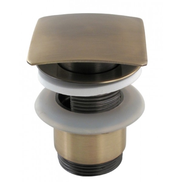Stylová umyvadlová výpusť v provedení s povrchovou úpravou BRONZ, s ovládáním pomocí tlačení na zátku ve tvaru čtverce.
