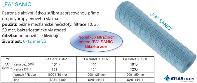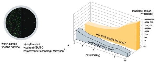Nová řada patentovaných filtrů SANIC je vyrobena převratnou technologií Microban , která obsahuje antimikrobialní látky. Microban využívá známé biocidní* vlastnosti stříbra. Začlenění účinné látky (stříbra) do každé časti filtru, která příjde do styku s vodou (patrona, nádoba) zajišťuje filtrům řady SANIC bakteriostatické vlastnosti a účinně zastavuje růst bakterií. S řadou SANIC získáte bezpečně čistou pitnou vodu se zárukou efektivní jemné a dlouhotrvající filtrace ve srovnání s běžnými, na trhu dosud dostupnými filtry. Základní výhodou filtrů a kartuší řady SANIC je schopnost zamezení nárustu bakterií, které se množí v usazeninách zachycených v kartuších a na stěnách samotného filtru.