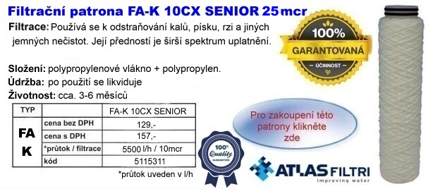 Vodní filtr SENIOR "K" 6/4" 2P - 10" CX s mosaznou hlavou a odkalením, italského výrobce ATLAS FILTRI.