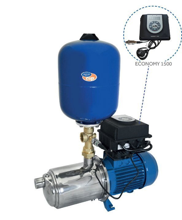 Automatické vodárny s odstředivým vícestupňovým čerpadlem s nerezovým pláštěm,tlakovou nádobou s vakem a frekvenčním měničem otáček motoru ECONOMY.Systém je určený pro komfortní dodávku vody do rodinných domů a středně velkýchprovozů. Díky vysoce účinné hydraulice a inteligentnímu frekvenčnímu měniči jevodovodní systém stále pod konstantním tlakem, chráněn proti chodu nasuchoa pracuje jen s nezbytně nutnou spotřebou elektrické energie.Zařízení lze využít i pro posílení tlaku ve vodovodním řadu.