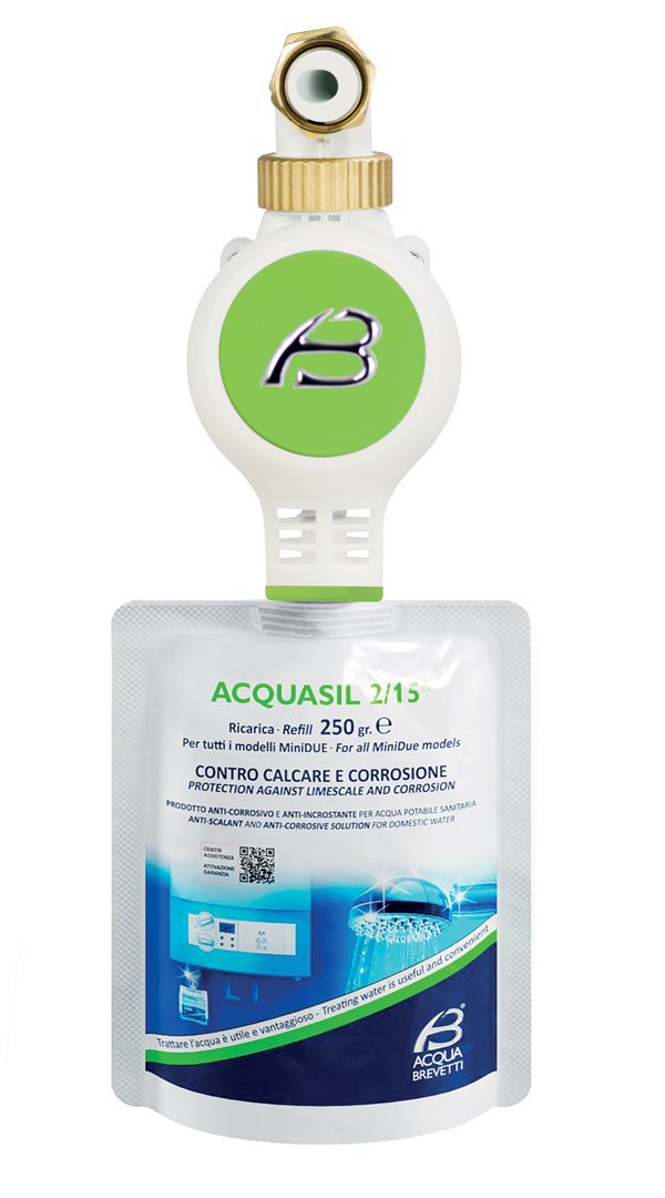 Mechanické objemové dávkovací čerpadlo pro dávkování AcquaSIL 2/15®, přípravku nabázi polyfosfátů, a to i při velmi nízkých koncentracích, zabraňuje tvorbě vodního kamenea korozi v rozvodech teplé vody. Přípravek AcquaSIL 2/15® se dodává v jednorázovýchsáčcích o velikosti 250 ml.