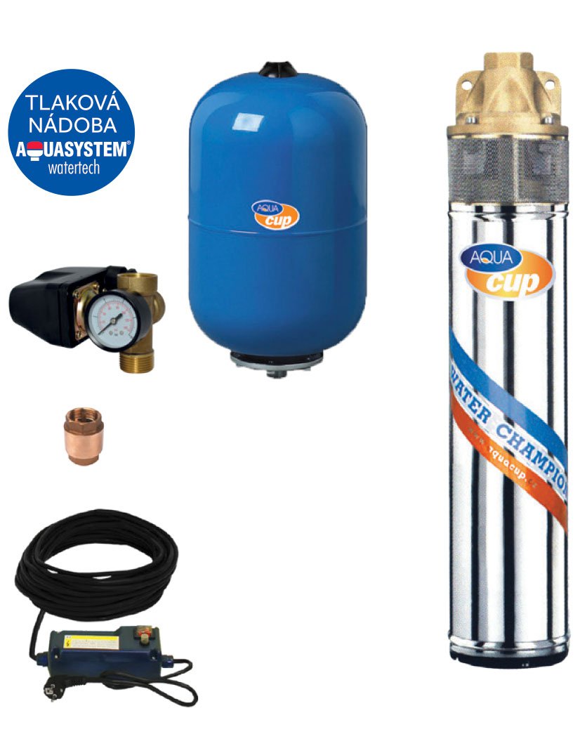 Domácí vodárny s ponorným 3" nebo 4" čerpadlem SIGI, tlakovou nádobou s vakem 24 l, 20 m přívodním kabelem, ovládacím boxem a příslušenstvím.