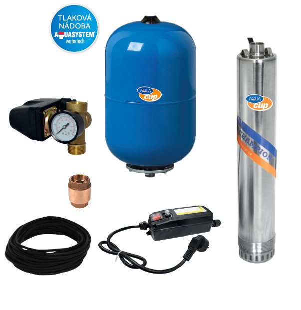 Domácí vodárna s ponorným 4” čerpadlem, ovládacím boxem a příslušenstvím. Vodárna je vhodná pro instalaci ve studních a vrtech nebo tam, kde není možné použít povrchové čerpadlo.